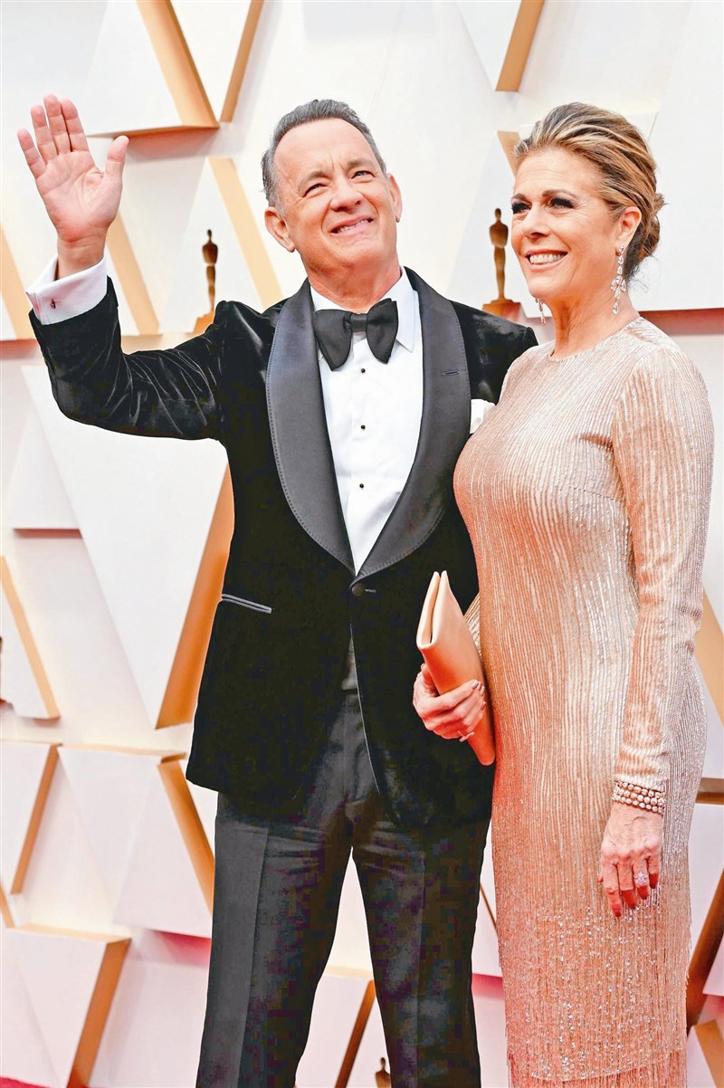 湯姆漢克斯(左)與妻子在澳洲染疫。圖為兩人二月出席奧斯卡頒獎。圖╱美聯社