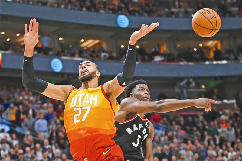 爵士隊中鋒戈貝爾(左)確診新冠病毒,NBA官方緊急宣布全面停賽。圖╱法新社