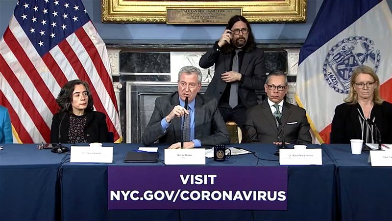 因新冠病毒疫情惡化,紐約市長白思豪(前左2)12日宣布全市進入緊急狀態。圖/取自twitter.com/NYCMayor