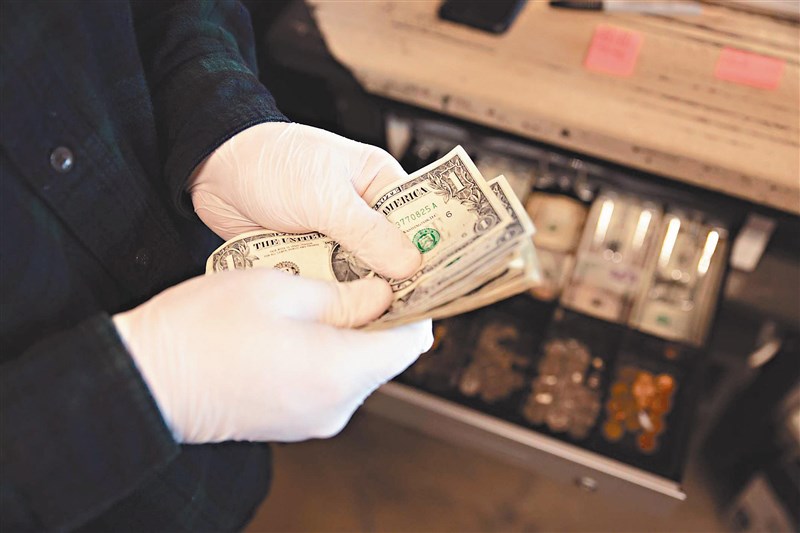 為防止新冠病毒傳播,美國俄亥俄州宣布州內所有酒吧與餐廳只能營業到晚間9時。(圖)為一家咖啡店員戴著手套數鈔票。阿根廷則關閉邊境15天,禁止外籍人士入境。阿國民眾搶購物品,以備檢疫隔離期所需。圖/法新社