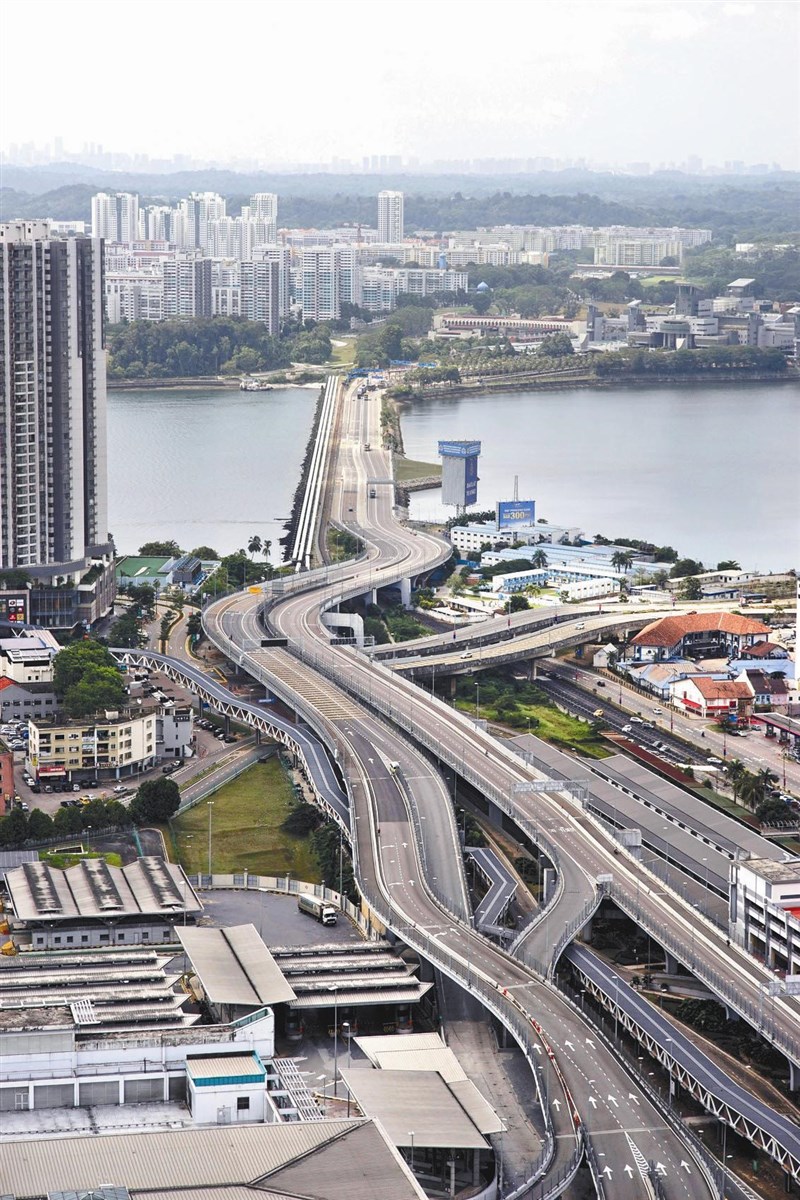 為防止新冠病毒疫情持續擴散,馬來西亞十八日起鎖國直至本月底,圖為馬國柔佛與新加坡之間柔新長堤道路「空無一車」的景觀。圖/美聯社