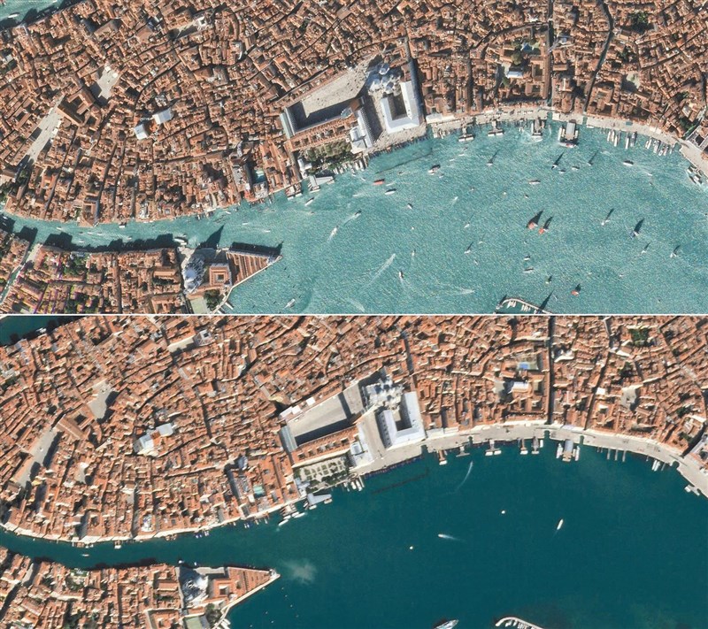 另外,從歐洲太空總署提供的最新高空俯瞰影像可看出,義大利上空汙染減少,尤其是含有二氧化氮的廢氣;而威尼斯聖馬可廣場附近水域幾已無船隻。圖╱法新社