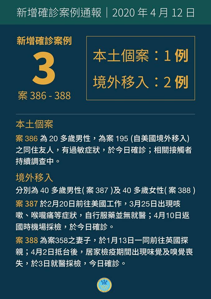 指揮中心表示,今日新增2例境外移入個案分別為40多歲男性(案387)及40多歲女性(案388)。其中案387於2月20日前往美國工作,3月25日出現咳嗽、喉嚨痛等症狀,自行服藥並無就醫;4月10日返國時機場採檢,於今日確診。案388為案358之妻子,1月13日一同前往英國探親;4月2日抵台後,居家檢疫期間出現味覺及嗅覺喪失,3日就醫採檢,今日確診。