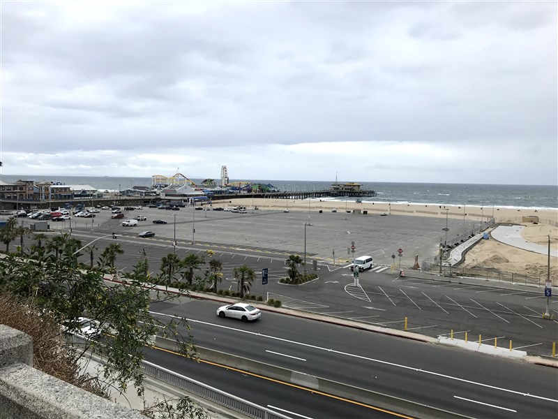 美國人服從居家隔離,圖為觀光景點聖塔蒙尼加海灘停車場冷清的景況。圖/中央社
