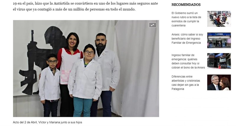 圖說:42歲的納瓦洛(後右)與妻子瑪麗亞娜(後左)帶著兩個孩子,在南極的埃斯佩蘭薩基地生活,這裡有座全阿根廷唯一正常上課的學校。圖╱取自lanacion網站
