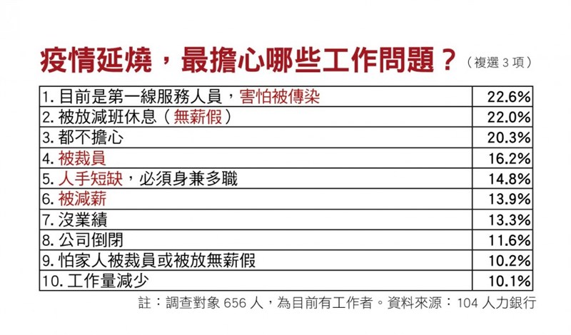 如何因應無薪假 企業重組拚生存 員工練功增能力 |2020.04.17 語音朗讀 2998觀看次 字級 大 中 小 疫情深不見底,放不放無薪假,企業和上班族都很憂心。圖/中央社疫情延燒工作調查。資料來源/104人力銀行 疫情當頭,不少企業受到衝擊,讓員工減班在家休假,於此同時,卻有一些企業趁此時機大舉徵才,而根據人力銀行的數據顯示,求職市場的工作職缺並沒有減少,求職、轉職的動能也持續存在,究竟放無薪假的企業和員工,該如何因應?或是乾脆企業趁此休業、員工轉職找新工作?文/趙肇全球新冠病毒疫情嚴重,一時看不到盡頭,各國經濟深受衝擊。根據勞動部統計,截至 3 月底止,全台已有近 150家企業、近萬名員工受到影響,申報實施「減班減薪」(俗稱「無薪假」),讓不少受薪階級大喊繳不出房租、房貸。事實上,除了「減班減薪」的應急措施,溫和些的以採取鼓勵特休、遇缺不補、外派及升遷暫停占最多,也有企業啟動縮減工時、周休三日,甚至直接裁員、減薪,但企管顧問對企業「斷尾求生」的做法,卻抱持保留的看法。放不放無薪假 都擔心104 人力銀行最新一份千人會員的調查發現,正在減班休息(無薪假)的受訪者占比是 2.4%,較多數受訪者的狀況是「公司鼓勵申請特休假」、「公司已停止雇用工讀生或遇缺不補⋯⋯」,公司直接裁員的則占 2.3%。除了已經被放無薪假者心中充滿無奈和擔憂,其實目前84.3% 還在正常工作者,內心也擔心未來疫情會影響到自身工作,其中最大的擔心就是:怕服務顧客或工作時被傳染、被放「無薪假」。104 調查顯示,「都不擔心」的僅 20 .3%;最擔心的問題是「第一線服務人員,害怕被傳染」占22.6%,怕被減班休息(無薪假)占 22.0%。另外也有 16.2% 害怕被裁員、14.8%擔心人手短缺。做好準備待疫情結束資深講師與企業顧問嵇德明指出,由於疫情持續延燒,消費者人心惶惶,減少外出用餐及逛街次數,餐飲業、飯店業、服務業及旅遊產業哀鴻遍野,不得不裁員或放無薪假保命,但依據過去經歷多次危機的經驗,當疫情過後,人才將變得非常難找,屆時如何搶得下一波蓄積已久的爆發能量,端賴這段期間有沒有做對因應之道,事先儲備人才,協助在職員工進行教育訓練。所以對於受到減班休息(無薪假)衝擊的員工及企業,104 人力銀行資深副總經理暨人資長鍾文雄、資深講師與企業顧問嵇明德,建議可分別做出以下的因應之道,改造體質超越舊我,讓企業及員工在疫情過後,以最好的狀態迎接社會爆發的能量。疫情深不見底,放不放無薪假,企業和上班族都很憂心。圖/取自網路企業端:洗牌重組,適者生存 1.啟動危機管理,讓客戶安心遇到疫情,應立即啟動危機管理。即便平時公司內部也沒有危機管理及危機預防的制度,這時也應趕緊建立危機管理程序,搜集各種業態之因應做法,進行複製或微調,並提出適合自身企業的內部做法。對外應立即提供讓顧客安心的防疫對應措施。像是店內定期消毒,進出人員進行健康管理等,並要將店家如何因應的資訊廣泛讓大眾知道,讓潛在消費者安心。像是可以製作防疫安心的影片於店外的電視牆,或是各大社群平台上播放。2.實施促銷方案,開發新產品面對疫情衝擊業績,許多商家面臨業績大幅下滑的狀況,為了鼓勵顧客消費,可以實施促銷方案。像目前國內各大飯店,都釋出相關促銷活動。若別人在打折,自己還是維持原價,原有消費者可能流失的更嚴重。除了促銷之外,也可以加緊腳步開發新產品。尤其跟防疫相關的產品,此時容易受消費者青睞,像是防疫、消毒、增強抵抗力相關的產品設計等。新產品有機會可以彌補因疫情衝擊而下滑的業績。3.趁空閒舉辦員工教育訓練此時也是加強練兵的好時機,可以利用空閒時製作服務訓練教案,並辦理內部訓練。若經費不足,也可查詢政府有無相關的獎勵訓練之補助方案,或是送重點培訓員工到外部參加公開班課程。特別是顧客減少,導致服務人員排班減半,空閒時間更有利於進行服務教育訓練。等疫情過後,顧客重新上門時,立刻就會以眼神回饋「不一樣喔」。一旦服務人員的品質提升,服務時的言語、動作、流程變得更加細膩,顧客未來繼續回流消費的意願必然大大提升。4.人員招強汰弱,維修機具設施重新檢視自身的體質是否穩健。一般公司都會定期安排時間進行歲修(有些也會暫停營運好幾個工作天),此時除了趁機進行機具設施維修調整,針對人員也須進行盤點,此時可能因為大環境因素,有許多優秀人才釋出,可趁機招募進來,並汰換較不適任的員工。事實上,危機就是轉機,這一波疫情應該會讓市場洗牌重組,適者生存,不適者淘汰。不管是個人或企業,應趁機檢視自身經營的各種面向。尤其企業須針對疫情快速因應,推出具體措施讓消費者安心。不能再採取觀望態度,速度就是決勝點。員工在無新假來臨時,須好好思考下一步。圖/取自網路員工端:調整心情,練功提升1.查詢法規,了解相關權益若因疫情影響被放無薪假或被資遣,一定要記得了解相關權益。像是無薪假並不是老闆說了算,需經勞資協調。就算是無薪假,也不是真的「無薪」,雇主還是需給付全職工作者基本工資 23800元。若是被資遣,雇主也需給付資遣費。因此若不幸遇到這種狀況,記得要查詢勞動部法規,保障自己的權益。2.調整心情,做好情緒管理一輩子的職涯中,或多或少都會遇到挫折或是失業的時候,受疫情影響更不是個
