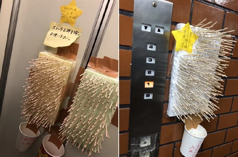 有日本網友最近在Twitter上載相片表示近日乘搭電梯,發現按鈕旁竟有塊保麗龍板,表面插著數十枝牙籤,保麗龍板旁有便條紙寫道:「請使用這個去按電梯按鈕」,保麗龍板下還有紙杯讓使用者丟掉使用過的牙籤。