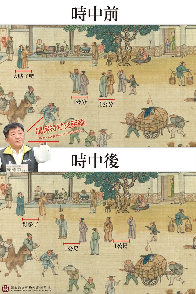 故宮南院國寶展「清明上河圖」,碰上疫情,遊客減少,臉書社群年輕小編們,引用清明上河圖上古人生活、相處距離,以圖文並茂,提醒「順時中」,清明上河圖的人兒們,都知道保持社交距離,疫情指揮中心建議人與人之間,室內保持1.5公尺、室外保持1公尺距離。