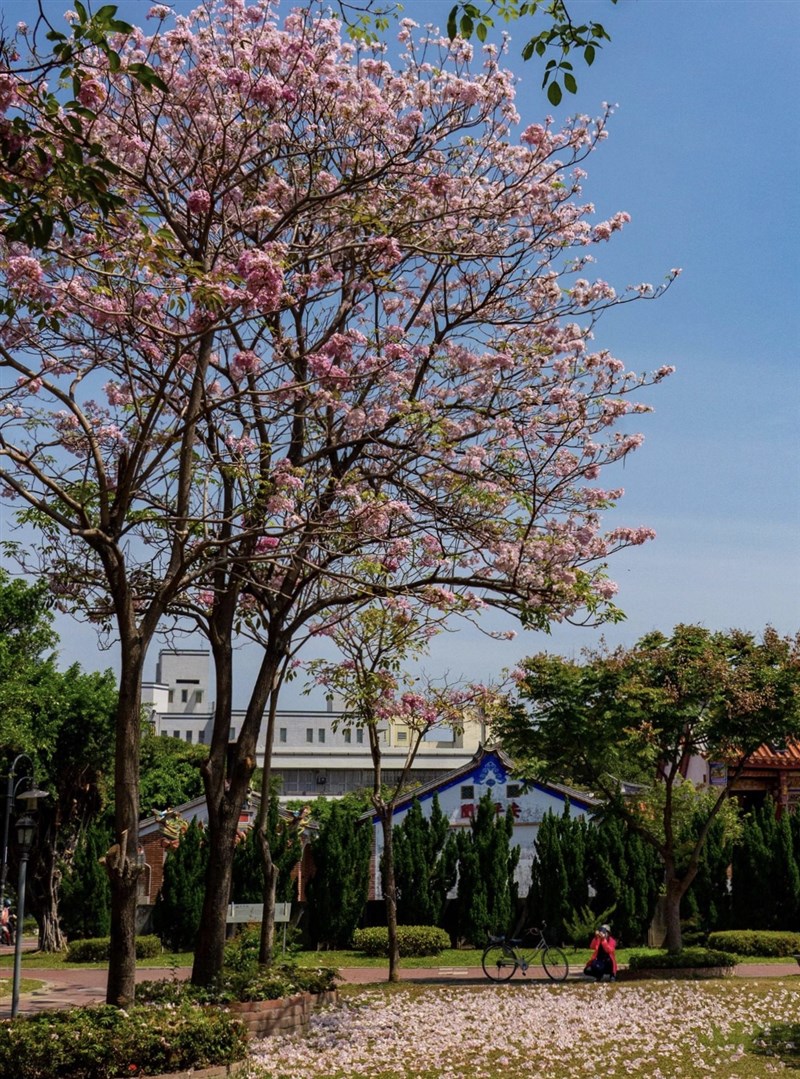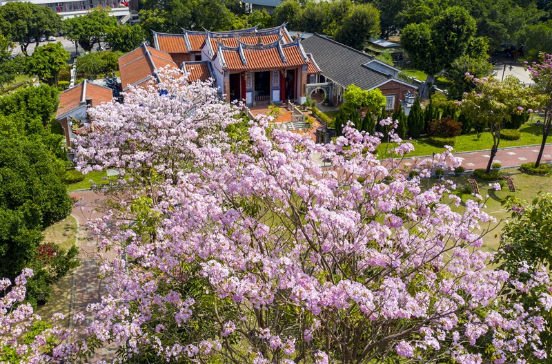 圖說:彰化縣員林公園興賢書院前的洋紅風鈴木正盛開,美不勝收。圖/馬先生提供
