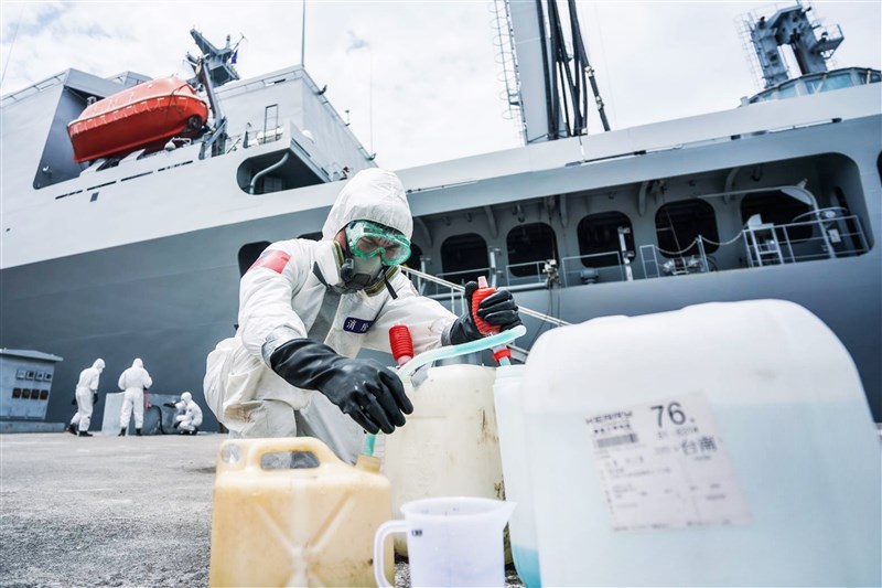 陸軍三九化兵群昨至磐石艦執行消毒作業。圖/國防部提供