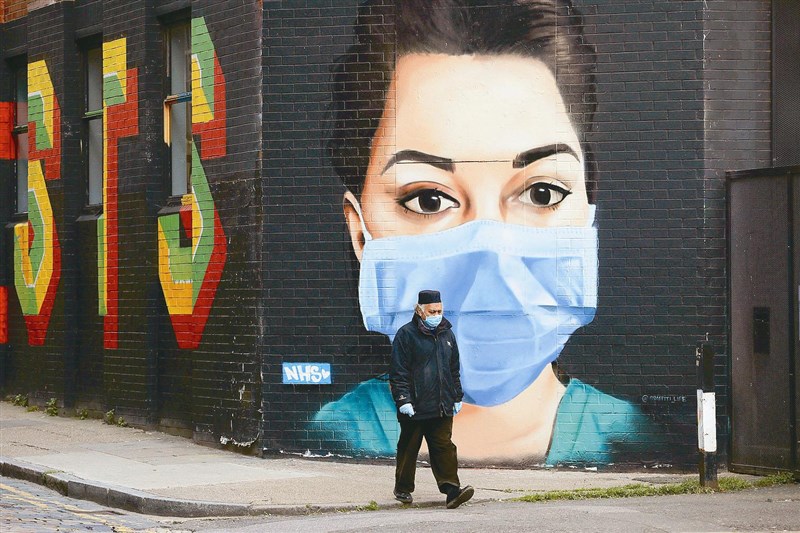 向醫護致敬英國東倫敦一名戴口罩和手套的男子二十三日經過街頭藝術家斯皮德感謝醫護人員防疫貢獻的塗鴉。