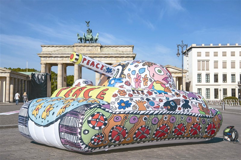 德國萊比錫的普普藝術家費舍爾將設計的充氣坦克放在柏林布蘭登堡門展示,希望喚醒對戰爭無感的人們並倡導和平。圖/美聯社