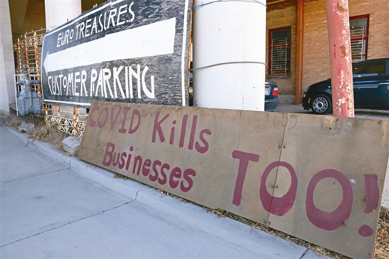 由於新冠病毒導致客戶銳減,美國猶他州鹽湖城的伊凡斯被迫關閉經營四十年的歐洲寶藏骨董店。八日一張寫著「新冠病毒也殺死商業」的標語擺在店門口。圖/美聯社