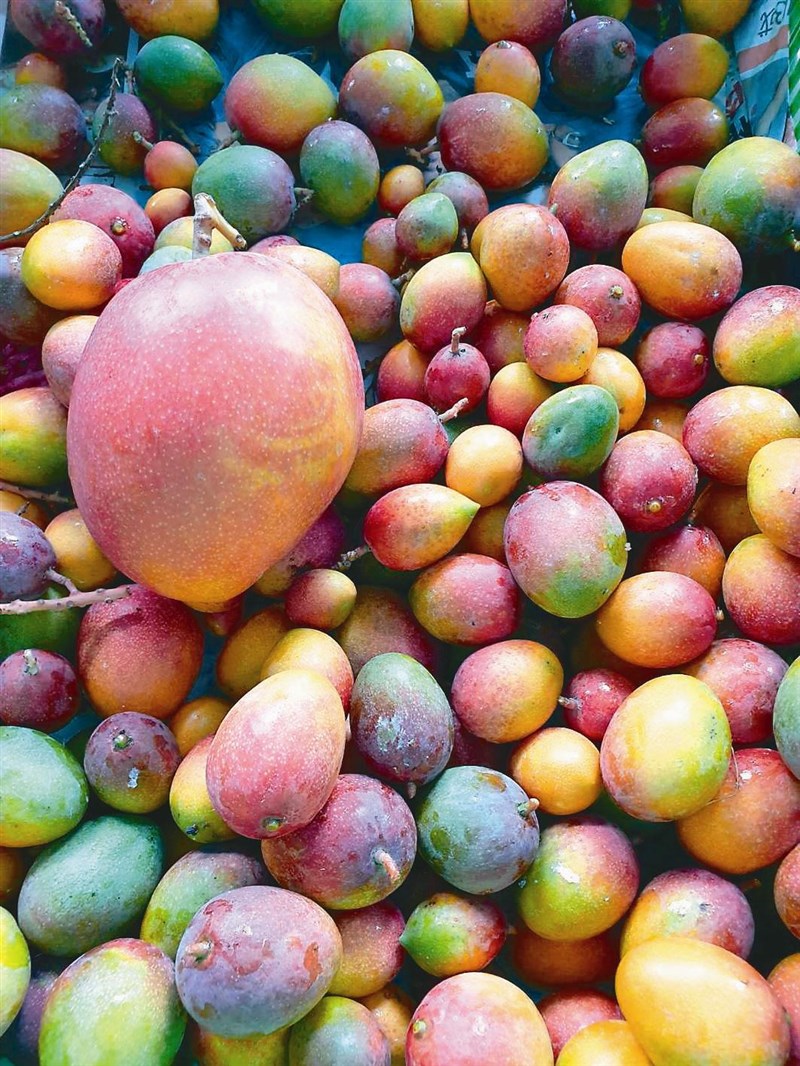 屏東縣枋山鄉果農董昱劭推出的「珍珠芒果」,大小僅有正常愛文芒果的十分之一。圖/潘欣中