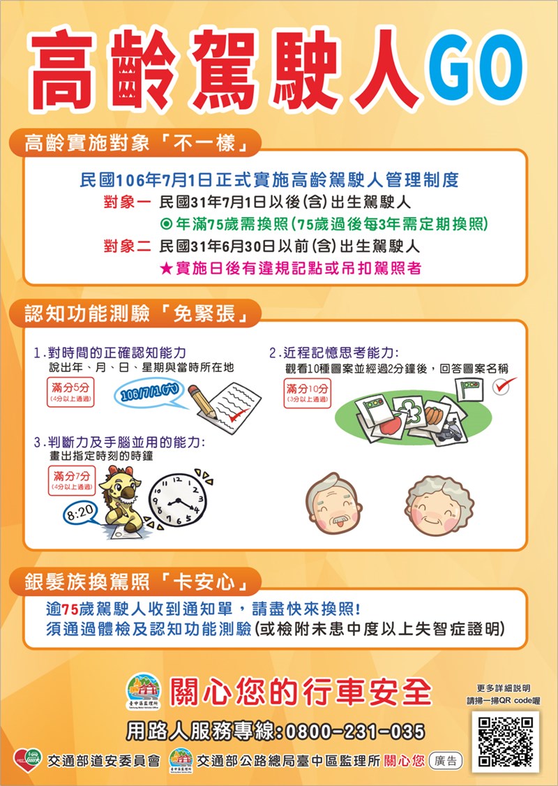 3.5萬人繳回駕照 高齡換照7/1時限將至 |2020.06.04 語音朗讀 3837觀看次 字級 大 中 小 銀髮族駕駛示意圖。圖╱資料照片 【本報台北訊】過去台灣的駕照是終生有效,但隨人口老化,長者生理退化成為交通安全的隱憂,近年發生多起老人駕車事故。交通部推動高齡駕駛換照至今近3年,逾17.7萬人辦理換照,由於須通過體檢及認知測驗,才能換短效駕照,當中約20%繳回駕照。比鼓勵自發性繳回時期的8%,明顯有成。2014年至2016年交通部公路總局曾鼓勵70歲以上長者主動繳回汽機車駕照,不過效果不顯著。以當年有13萬70歲以上高齡駕駛的桃園市為例,一年不到200人繳回。然而過去4年,65歲以上駕駛車禍死亡人數增加近10%、受傷更多了32%。交通部要求2017年7月1日以後才屆滿75歲的長者必須受檢,更換只有3年的短期駕照;或是已滿75歲,發生特定違規或被吊扣駕照的人,也要通過測試換照。開辦的時候給予3年的彈性,公路總局說,2017年7月1日過75歲生日的駕駛人約5800人,近8成來換照或繳回,推測剩下2成的人認為自己不會再騎開車,直接放棄駕照的可能性高。首批應換照的人如果7月1日前沒來受測更新,駕照將在6月30日逾期。公總表示,駕照逾期後,騎開車被攔查到或違規肇事須3個月內來換照,不然要罰1800元至3600元。仍不來換,就要繳回駕照,不然也會被註銷。圖說:銀髮族駕駛示意圖。圖╱資料照片3年前實施新制時,部分意見質疑比75歲更老的駕駛不必換照卻仍可開車,政策明顯有問題。對此,公路總局說,已委託學術單位研究,不排除未來全面納管換照。公總說,至今年5月為止,基層人員努力宣導通知了25.2萬滿75歲的長者來換照,約7成的人配合,其中有3.5萬人因為未通過測試、自願不開車或失能、死亡等,繳回駕照。3年前實施新制時,公總擔心衝擊過大,並不是75歲以上全面換照,惹來外界質疑更老的人不必換照仍可開車上路。公總說,未來是否全面納管換照,已委託學術單位研究,預計8月底有期末報告。圖說:高齡駕駛人實施對象等需知。圖/取自公路局 前一篇文章 拚經濟! 梅克爾撒1300億歐元振興德國 下一篇文章 陸船出沒台灣灘盜砂 海巡取締強制回填 熱門新聞 01奉行四給 劉宗澤獲昆大傑出校友獎2025.10.3002【人間有愛 】提早十分鐘2025.10.3003人間佛教聯合總會赴梵蒂岡 參與宗教對話宣言60周年慶2025.10.3004桃園花彩節 周末大溪登場2025.10.3005【寶島踏查】新竹湖口老街天主堂2025.10.3006輝達總部選址確定 落腳北士科T17、T182025.10.3007燕子口堰塞湖消失 台8線開放通行 2025.10.3008推廣兒童歌仔戲 鄉村巡演明開跑2025.10.3009習川會今登場 台海議題受矚2025.10.3010以控哈瑪斯違反協議 再空襲加薩2025.10.30 訂閱電子報 台北市 天氣預報 台灣一週天氣預報 相關報導 【星雲大師如是說】處事禪心【星雲大師如是說】人間佛教【星雲大師如是說】正信之美【星雲大師如是說】輪轉相繼【星雲大師如是說】有情的層次【星雲大師如是說】六忍歌