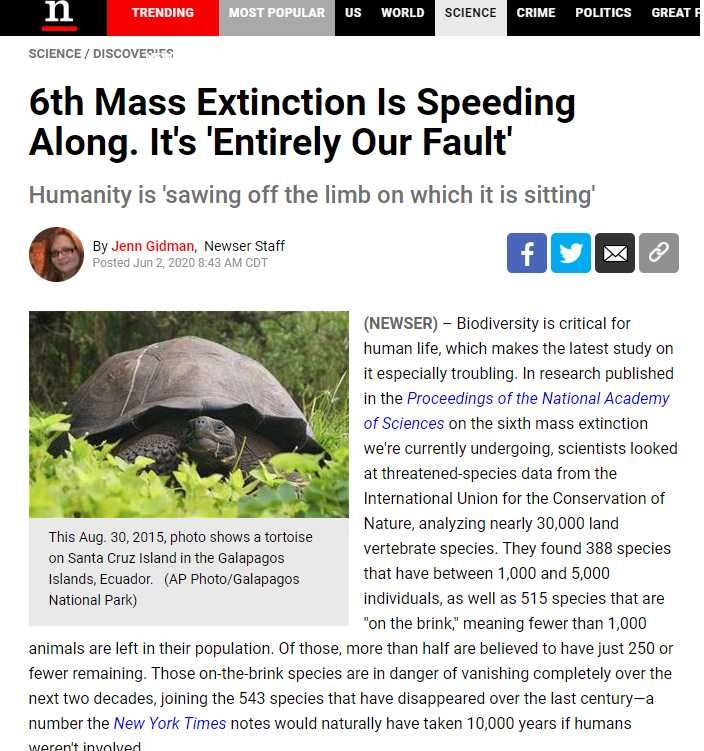 聯合國警告:百萬種生物 數十年內恐滅絕 |2020.06.04 語音朗讀 1045觀看次 字級 大 中 小 研究顯示第6次物種大滅絕進度比預想的快。圖/Pixabay 【本報綜合外電報導】地球現正進行著第6次物種大滅絕嗎?根據聯合國近日發布的報告指出,最新研究顯示,人類在地球上的活動嚴重影響動物的生存環境,造成大批野生動物瀕臨滅絶,專家估計大約有500種哺乳動物、鳥類、雙棲動物和爬蟲類動物危在旦夕。聯合國近日發布的報告顯示,地球有上百萬物種瀕臨滅絕,恐在未來數十年內完全消失,人類是造成的主要原因。另外,聯合國政府間生物多樣性和生態系統服務科學政策平台(IPBES)主席華森(Robert Watson)也指出,地球過去五個階段的大規模滅絕中,每一次大規模滅絕我們損失了75%的物種。所謂大滅絕或生物集體滅絶指的是在相對短暫的時間中,在一個以上並且較大的地理區域內,生物數量和種類急劇下降的事件。據科學家推測,自地球誕生以來,曾經出現過的生物98%均已滅絕。圖說:專家稱第6次大滅絕正展開,需時1萬年絕種規模在過去100年發生。圖/Newse如果說以前的物種大滅絕原因像是火山爆發或是小行星撞擊地球等天災,那麼現在的物種滅絶則是人禍,人類是造成這些動物滅絶的罪魁禍首。數十年來人類危害又毒害森林、海洋、土壤與空氣造成的巨變,對人類社會構成的威脅「至少與氣候變遷相當」。包括墨西哥國立大學的傑拉多希巴洛斯教授(Gerardo Ceballos)在接受BBC的採訪時表示,地區性的生態系統正面臨崩潰的危險。他指出,透過研究和親眼所見,滅絶危機非常嚴重,並稱所有人在未來10年到50年的行為將決定人類的未來。傑拉多希還表示,這些動物生活在南極洲以外的6大洲,棲息地受到人類活動的高度影響,而且集中在熱帶和亞熱帶地區,例如金絲狨、埃塞俄比亞狼、爪哇犀牛、西班牙帝雕、黃耳長尾鸚鵡、恆河鱷和中美洲綠黑斑毒蛙等。圖說:美洲熱帶的極危黃耳長尾鸚鵡。圖/取自維基 前一篇文章 陸船出沒台灣灘盜砂 海巡取締強制回填 下一篇文章 新冠病毒》印度確診病例數破20萬 中南美洲疫情續蔓延 熱門新聞 01奉行四給 劉宗澤獲昆大傑出校友獎2025.10.3002【人間有愛 】提早十分鐘2025.10.3003人間佛教聯合總會赴梵蒂岡 參與宗教對話宣言60周年慶2025.10.3004桃園花彩節 周末大溪登場2025.10.3005【寶島踏查】新竹湖口老街天主堂2025.10.3006輝達總部選址確定 落腳北士科T17、T182025.10.3007燕子口堰塞湖消失 台8線開放通行 2025.10.3008推廣兒童歌仔戲 鄉村巡演明開跑2025.10.3009習川會今登場 台海議題受矚2025.10.3010以控哈瑪斯違反協議 再空襲加薩2025.10.30 訂閱電子報 台北市 天氣預報 台灣一週天氣預報 相關報導 【星雲大師如是說】處事禪心【星雲大師如是說】人間佛教【星雲大師如是說】正信之美【星雲大師如是說】輪轉相繼【星雲大師如是說】有情的層次【星雲大師如是說】六忍歌