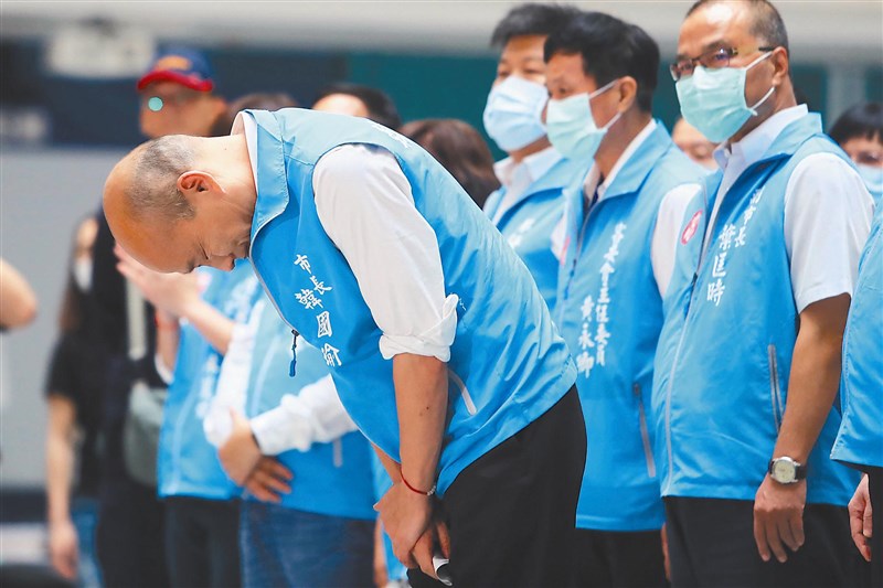罷免案結果底定後,高雄市長韓國瑜率領市府團隊舉行記者會發表談話,會中深深鞠躬向所有支持者致意。圖/中央社
