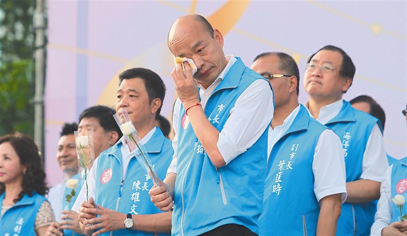 高雄市長韓國瑜昨天最後一天上班,鳳山行政中心舉辦草地惜別音樂會,現場擠入上萬支持者,大喊韓國瑜加油,讓韓國瑜也忍不住拭淚。圖/劉學聖
