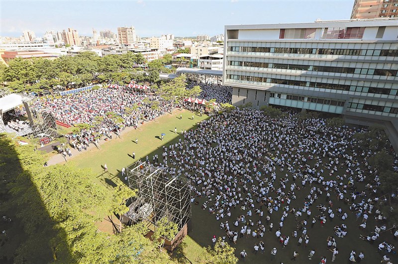 高雄市府昨下午舉辦「真愛高雄,珍重再見」音樂會,率市府團隊向市民道別並致謝。上萬名支持者擠爆鳳山行政中心草地,許多人頂著烈日一早就來占位,不少人站在樹蔭或建築物下等韓現身。