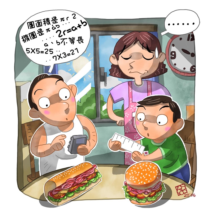 潛艇堡比划算? 文/鍾邦友(高雄高工數學老師) |2020.07.06 語音朗讀 1987觀看次 字級 大 中 小 星期六早上,小偉一家人至早餐店吃早餐,爸爸點了2個沙拉潛艇堡,店家說潛艇堡只剩1個,問爸爸另1個可否改以一般圓形的漢堡來做?爸爸說:「當然好啊,一樣的價錢圓形的面積更大,沙拉更多,反而還更划算。」 圖/BOB 星期六早上,小偉一家人至早餐店吃早餐,爸爸點了2個沙拉潛艇堡,店家說潛艇堡只剩1個,問爸爸另1個可否改以一般圓形的漢堡來做?爸爸說:「當然好啊,一樣的價錢圓形的面積更大,沙拉更多,反而還更划算。」 圖/BOB 星期六早上,小偉一家人至早餐店吃早餐,爸爸點了2個沙拉潛艇堡,店家說潛艇堡只剩1個,問爸爸另1個可否改以一般圓形的漢堡來做?爸爸說:「當然好啊,一樣的價錢圓形的面積更大,沙拉更多,反而還更划算。」 圖/BOB 文/鍾邦友(高雄高工數學老師)星期六早上,小偉一家人至早餐店吃早餐,爸爸點了2個沙拉潛艇堡,店家說潛艇堡只剩1個,問爸爸另1個可否改以一般圓形的漢堡來做?爸爸說:「當然好啊,一樣的價錢圓形的面積更大,沙拉更多,反而還更划算。」但小偉卻認為潛艇堡看起來似乎比較大,頂多也一樣大而已,爸爸是不是吃虧了還搞不清楚?爸爸說:「要不然我們把2個沙拉堡都帶回家,實際丈量看看,是不是真的圓形漢堡比橢圓形的潛艇堡面積更大?」回家後,小偉發現圓形漢堡的直徑為10公分,而橢圓形的潛艇堡最長的部分(長軸長)14公分,最短處則是6公分(短軸長),平均也是10公分,長度上兩者不分軒輊,看來應該是一樣大,爸爸笑而不答。爸爸又問小偉,倘若將長軸加長2公分為16公分,那是否就會確定是橢圓形潛艇堡面積,大於圓形漢堡的面積?小偉說:「那是當然的啊!」,然而是否果真如此?若把橢圓形拉長爸爸再問小偉,正方形長方形的兩者的周長相同時,面積是否完全相同?小偉想起了之前在課本裡學過的算幾不等式:當a=b時,算幾不等式的等號才會成立,即周長相同的矩形,面積最大者是正方形,可是這又跟圓與橢圓有何關係?爸爸進一步說明,圓面積是πr2,橢圓則是πab(a、b各為長短軸的一半),共同約掉π之後便相當於正方形與長方形之間的關係,當2r=a+b,但a、b不等長時,圓面積便大於橢圓面積,所以直徑10公分的圓形漢堡面積是5X5=25平方公分,就大於而長軸14公分、短軸6公分的橢圓形潛艇堡面積(7X3=21平方公分)了。此外,即使將長軸加長2公分為16公分,8X3=24依然還是小於25,同樣是圓形漢堡的面積較大!「你們忙著算數學,可都忘了吃早餐了呀!」一旁媽媽提醒他們,才發現時間已過早上10點鐘了。「那我下次要點圓形漢堡才划算了,對吧?」小偉邊吃早餐邊問道。「沒錯,目測橢圓比較大,不過是一種心理上的錯覺,實際運算數據,才能得到真正的答案喔!」爸爸微笑回答。 前一篇文章 【科學尬新聞】 衣服晒過有太陽味 下一篇文章 徵稿啟事 熱門新聞 01桌球年終賽激戰 林昀儒力爭晉4強2025.12.1202【研朱札記】 臺灣第一本訪碑專著 《北臺灣之古碑》與石坂文庫2025.12.1103傳燈60.百年仰望紀念郵票 明年3月發行2025.12.0904泰國合艾水災 佛光山送暖助復原2025.12.1105佛光山人間大學新馬分校 結業展示所學2025.12.1006【人間行路】迷路的異鄉人 2025.12.0907光明大學宿霧藝術學院 三好音樂劇放光采2025.12.1108多倫多佛光山 佛光人行佛精進獲獎2025.12.1109洗衣公車 助街友找回自信2025.12.0910冰雪夜綻佛光 西來寺響應哈崗親子嘉年華2025.12.09 訂閱電子報 台北市 天氣預報 台灣一週天氣預報 相關報導 考考你的智力血液如何循環?如何保養血管?舊石器時代藝術林茲 電子藝術節地震變奏組曲── 主震、前震、餘震、群震