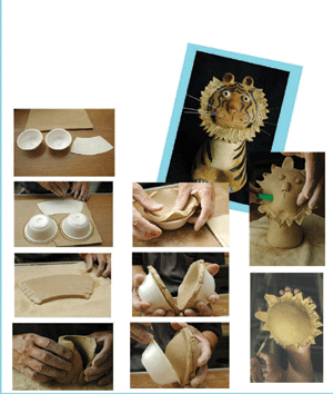 1~4. 將二個保麗龍碗倒扣在泥土上,切下泥土,不要切得剛好,要多留邊。接著,用梯形樣板切割出同樣的泥塊,將梯形泥板的兩側打薄,沾上泥漿,由底往上圈黏成一個椎型體,成為小老虎的身體。接著切一塊泥土做為底部,將身體垂直輕敲底部三下,使身體與底部黏緊。