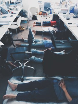 一名在越南工作的日本人,分享越南同事的午睡照片,神奇景象讓他驚呼「以為來到野戰醫院」。 圖/擷自推特