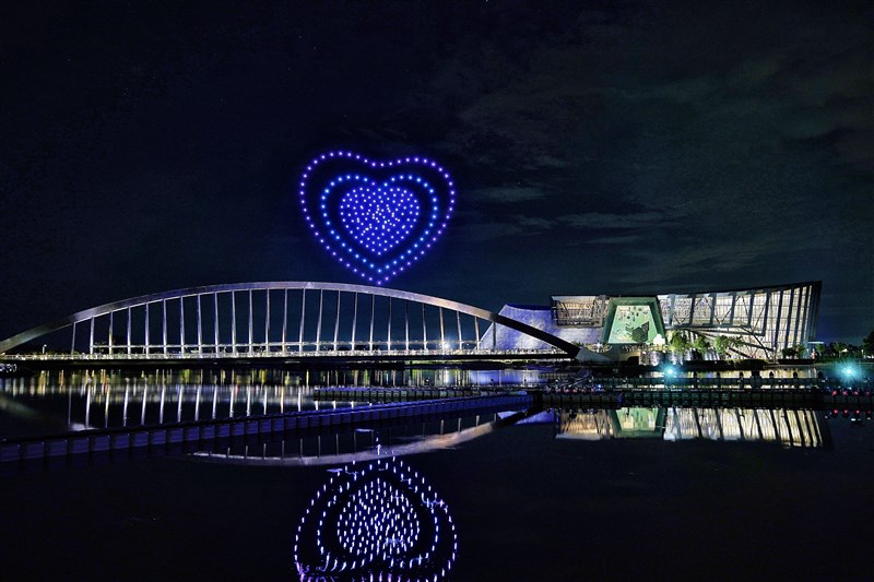 圖說:故宮南院七夕情人節特別版,由200架無人機排列出喜逢鵲橋、愛心等應景圖形,完美演繹幸福。圖/故宮南院提供