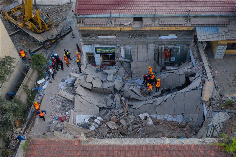 圖說:中國大陸山西省臨汾市襄汾縣,一間兩層樓高的酒店發生坍塌事故。圖╱中新社