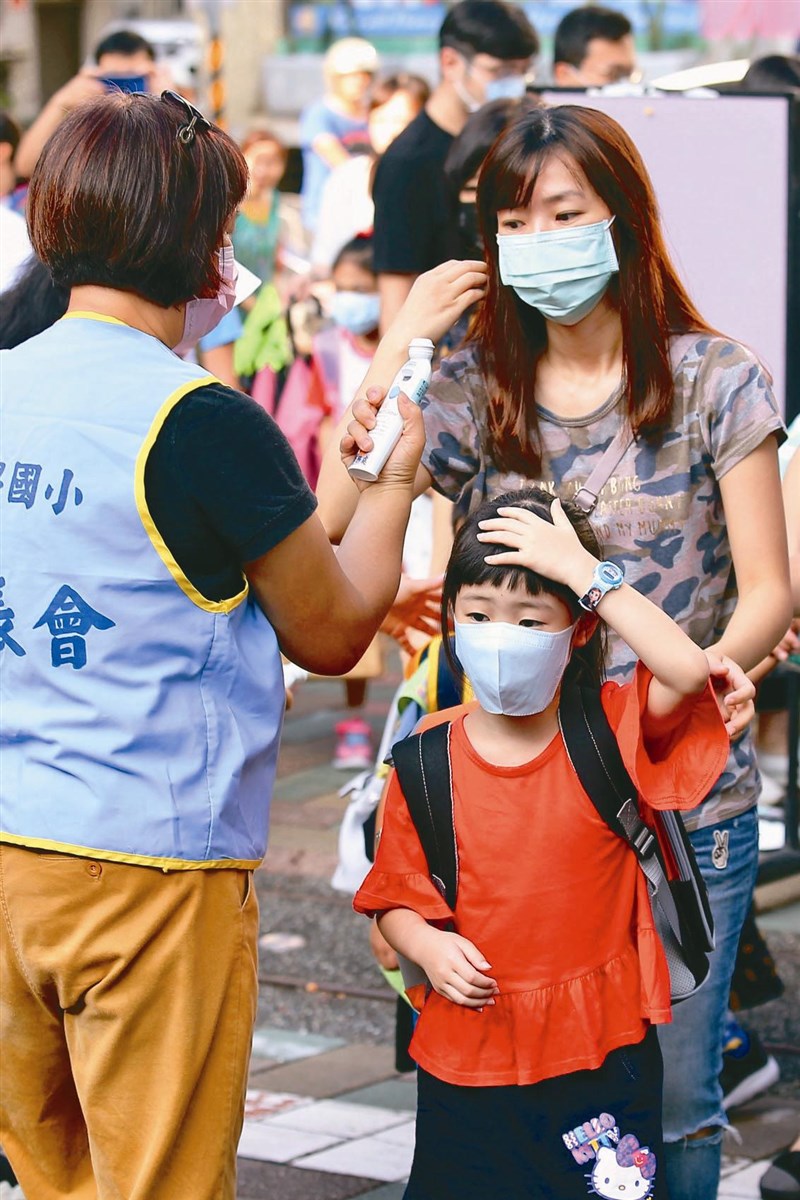 中小學昨天開學,台北市石牌國小新生入學與家長一同量體溫。