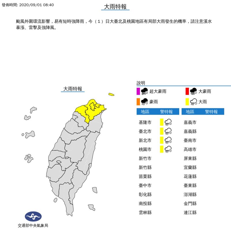 梅莎颱風登風王 北北基桃大雨特報 |2020.09.01 語音朗讀 877觀看次 字級 大 中 小 氣象局發布北北基桃大雨特報。圖╱中央社 【本報台北訊】中央氣象局最新針對4縣市發布大雨特報。氣象局說,中颱梅莎已成為今年風王,今(1)日上午有機會增強為強颱。至於關島北方海面熱帶性低氣壓,今天也有機會增強為今年第10號颱風海神,其中又以下半天機會最大。根據氣象局資料顯示,中颱梅莎今天凌晨2時位置在北緯26.0度,東經126.5度,以每小時16公里速度,向北北西進行。中心氣壓938百帕,近中心最大風速每秒45公尺,瞬間最大陣風每秒55公尺,7級風暴風半徑220公里,10級風暴風半徑80公里。氣象局說,梅莎今天清晨距離琉球群島很近,也相對台灣是最近的時刻,處於中颱上限,中心附近最大風速來到每秒45公尺,超越43公尺的巴威颱風和黃蜂颱風,是今年西太平洋的風王。圖說:梅莎颱風已登今年風王。圖/取自中央氣象局氣象局稍早針對4縣市發布大雨特報,受到颱風外圍環流影響,易有短時強降雨,今天大台北及桃園地區有局部大雨發生的機率,請注意溪水暴漲、雷擊及強陣風。氣象局同時發布長浪即時訊息,今天基隆北海岸、東半部含蘭嶼綠島、恆春半島沿海地區及馬祖有長浪發生的機率,上午6時彈東(蘭嶼)已觀測到浪高1.9米左右的長浪、宜蘭(蘇澳)已觀測到浪高1.8米左右的長浪,請注意。氣象局說,今上半天北部、東北部有間歇性降雨,慎防局部大雨發生,其他地區仍以午後雷陣雨為主。下班天梅莎颱風逐漸遠離,降雨會趨緩。氣象局說,明天環境廠仍偏西南風,迎風面中南部有局部傳陣雨,其他地區同樣要留意午後雷陣雨,以各地山區為主。圖說:中央氣象局對北北基桃發布大雨特報。圖/取自中央氣象局 前一篇文章 國防部:共軍資通電戰 已有能力癱瘓我海空反制作戰 下一篇文章 睽違45年 捷克議長將在立法院議場發表演說 熱門新聞 01【樹博士系列】土壤的祕密XV 水稻田減排新觀念IV 土地的溫柔革命 雲林大埤寫益生菌奇蹟2025.11.0902【寬鼎畫語】 看不見的真相2025.11.1003悅讀華嚴經 成為幸福安樂地球人2025.11.0904【森活日誌】意外的香遇2025.11.0905【視覺DJ 】給自己按個讚2025.11.0906星雲大師全集⑲【佛教管理學②】禪門的管理法⑧2025.11.0907【朗朗晴空】能替別人著想不會小2025.11.0908發現DNA雙螺旋結構 諾貝爾生醫獎得主 華生97歲辭世2025.11.0909佛光山書蔬展開幕 聚焦天天行三好2025.11.0910阿里山林鐵森里號 躍登國際2025.11.09 訂閱電子報 台北市 天氣預報 台灣一週天氣預報 相關報導 【星雲大師如是說】處事禪心【星雲大師如是說】人間佛教【星雲大師如是說】正信之美【星雲大師如是說】輪轉相繼【星雲大師如是說】有情的層次【星雲大師如是說】六忍歌