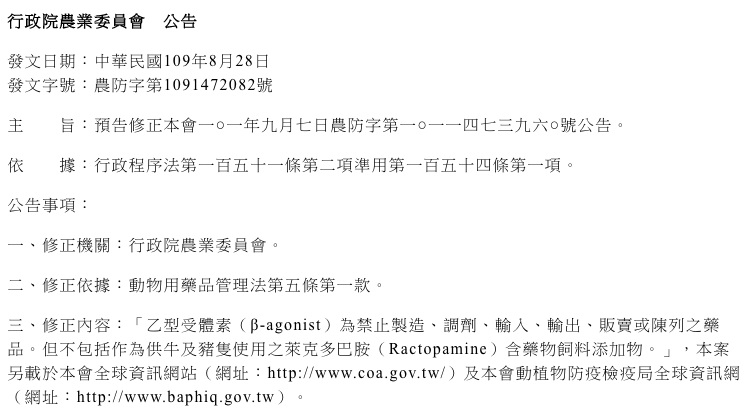 根據農委會在8月28日公告,動物用藥品管理法第五條第一款修正,乙型受體素為禁止製造、調劑、輸入、輸出、販賣或陳列之藥品,但不包括作為供牛及豬隻使用之萊克多巴胺含藥物飼料添加物。其中內文新增豬隻也可使用萊克多巴胺產品,此公告將於110年1月1日生效。