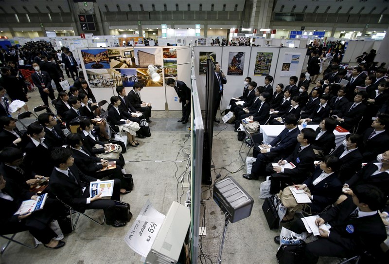 圖說:新冠疫情持續影響日本就業市場,圖為今年3月東京就業博覽會會場內一處坐滿求職者的攤位。圖/取自網路