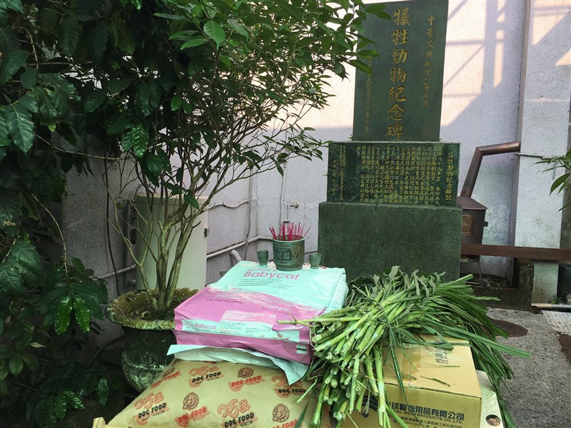 動保處表示,每逢中元節就會準備供品到碑前參拜,貓飼料、狗飼料、鳥飼料、牧草都是供品之一,有趣的是,拜完動物好兄弟,動保處還會轉往辦公室大門口祭拜好兄弟,一天之內就要拜上2次。