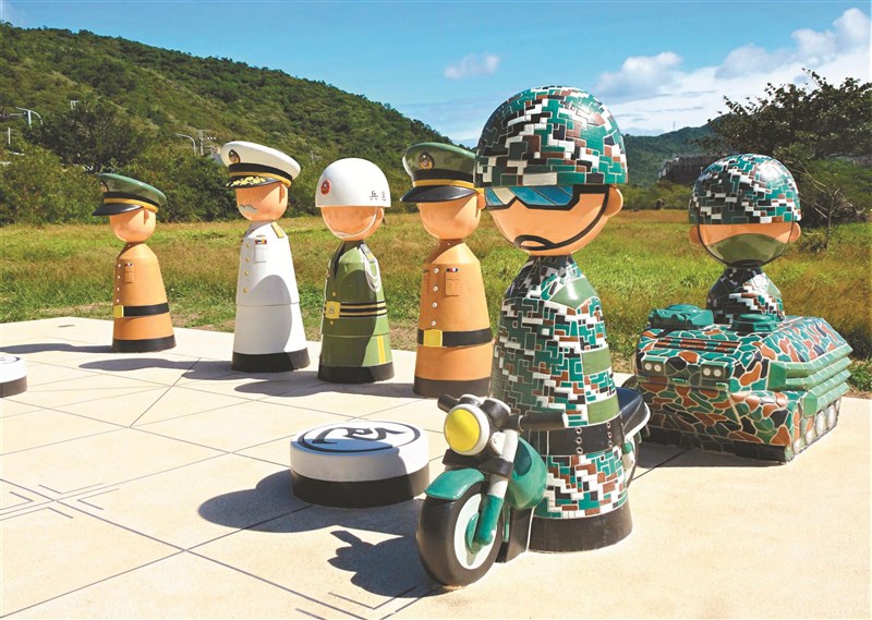 屏東聯訓基地創意棋台,逗趣可愛的官兵人偶意象,成為遊客拍照打卡新景點。圖/潘欣中