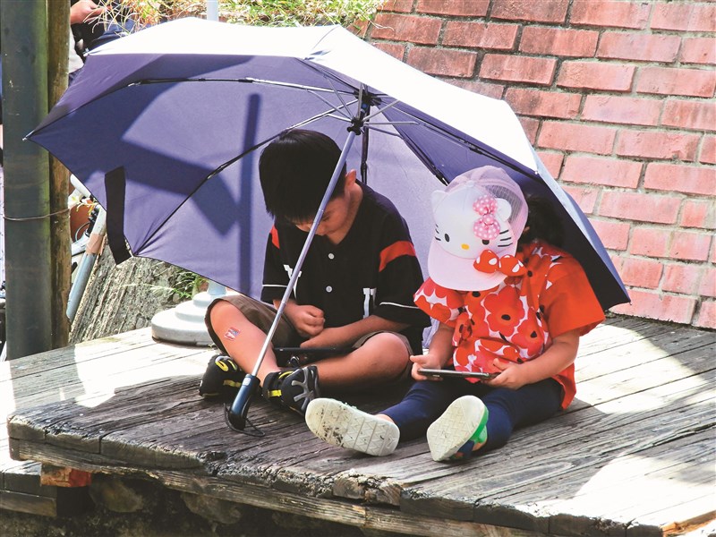 路旁一對小兄妹,用一把大傘遮住了「秋老虎」的攻擊,盯著手機玩得不亦樂乎!僅寸步之遙的吵雜人潮,好像都與他們無關,傘下的小小世界,就是他們的世外桃源,就是幸福!