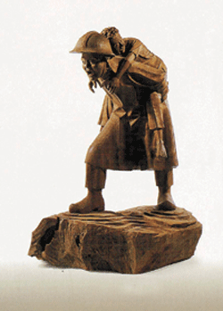 「我對人物有偏好,特別喜歡百工之人。」林進昌的作品,都是自己熟知、市井生活中的小人物,他以雕刀代替筆墨,書寫了這些因為匆忙而被忽略與遺忘的感動。如此作品「搶救」,即描述救助者與被救助者在危急狀況下的微妙互動。
