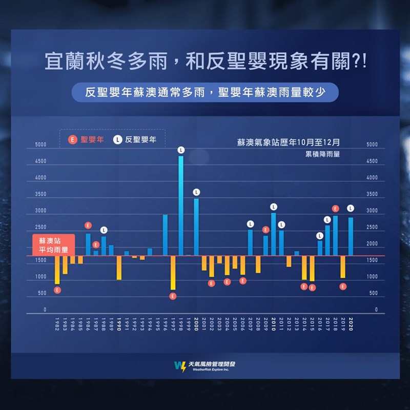 「天氣風險 WeatherRisk」臉書粉專表示,有趣的現象是,統計上「聖嬰現象」和「反聖嬰現象」對宜蘭在秋冬的降雨有很明顯的影響。出現「反聖嬰年」時,蘇澳雨量偏多的機率非常高,反之「聖嬰年」時雨量比較容易偏少。