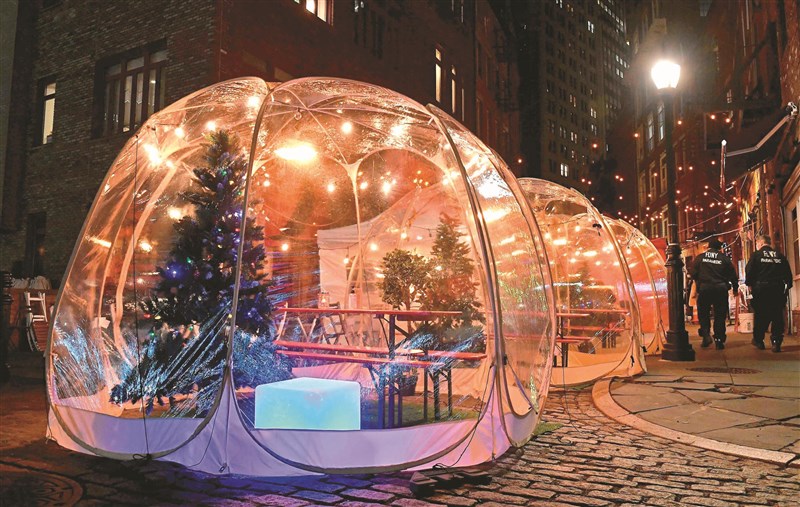 美國FDA十日投票贊成批准輝瑞疫苗的緊急授權使用申請,圖為紐約市一處街頭的社交距離帳篷。圖/法新社