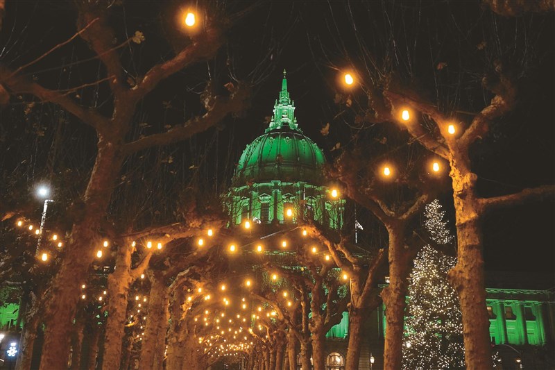 美國加州舊金山市政廳十二日點亮綠燈,紀念《巴黎氣候協定》五周年。圖╲美聯社