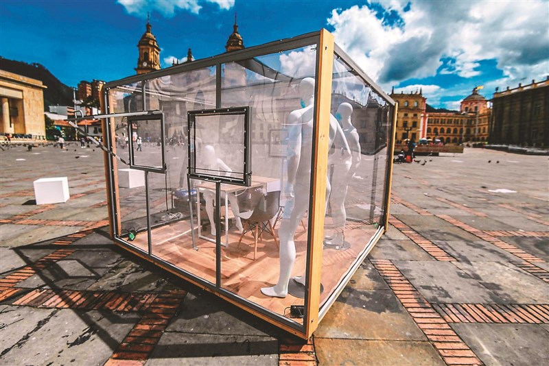 哥倫比亞首都波哥大的假人嘴裡竟然會吐煙,這是為了喚醒民眾注意新冠病毒如何在空氣中傳播。圖/法新社