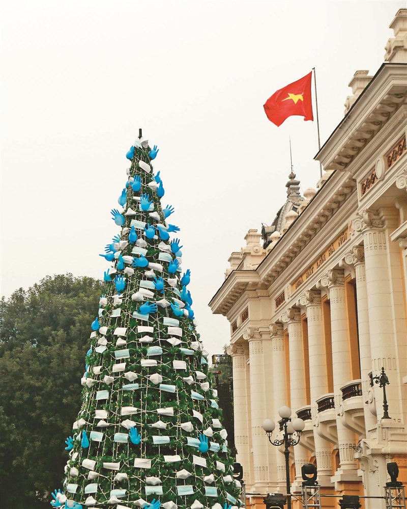 受到新冠疫情影響,今年的耶誕樹裝飾也和往年很不一樣,大圖為印尼峇里島一名男童二十四日和新冠病毒主題裝飾的耶誕樹合照。無獨有偶,越南首都河內二十四日街頭也出現以口罩和橡膠手套裝飾的新冠病毒主題耶誕樹。