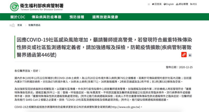 紐機師和女友人趴趴走 疾管署急發函憂社區感染 |2020.12.25 語音朗讀 2555觀看次 字級 大 中 小 紐國機師及廣明友人趴趴走,增社區感染風險,疾管署急發醫界通函。圖╱新華社 【本報台北訊】國內12月22日新確診1例新冠肺炎本土病例,為12月20日公布境外移入病例(案765)紐國機師接觸者,兩案在可傳染期間都曾於社區內走動、購物或吃飯,憂社區感染風險增加,中央流行疫情指揮中心今緊急發布醫界通函,籲醫師提高警覺,發現疑似個案應加強通報及採檢,防範疫情擴散。為加強新冠病毒相關監測,以阻斷社區傳播,指揮中心在醫界通函中提醒,各醫師於診療病人時若發現符合「嚴重特殊傳染性肺炎」通報定義,加強通報及採檢作業。憂社區感染風險增加,中央流行疫情指揮中心今緊急發布醫界通函,籲醫師提高警覺。圖/取自疾管署官網如發燒、呼吸道症狀、嗅/味覺異常、不明原因腹瀉及醫師高度懷疑社區肺炎等臨床條件、流行病學條件或檢驗條件者,請依「嚴重特殊傳染性肺炎通報個案處理流程」進行疾病通報與採檢。若病人不符合嚴重特殊傳染性肺炎通報條件之臨床症狀,但醫師認為有進行SARS-CoV-2檢驗之必要者,請依「COVID-19社區監測通報採檢及個案處理流程」,進行疑似個案通報與檢體送驗。目前國內累計770例確診病例,分別為675例境外移入,56例本土病例(含案771),36例敦睦艦隊、2例航空器感染及1例不明;另1例(案530)移除為空號。紐國機師及廣明友人趴趴走,增社區感染風險,疾管署急發醫界通函,示意圖非新聞當事人。圖╱新華社 前一篇文章 元旦連假 南迴太麻里段大客車優先 下一篇文章 變種病毒傳染力強 拉美3國疫苗開打 熱門新聞 01【遨遊藝事】巴黎 黛瑪兄弟茶館(Dammann Frères)2026.02.0602極樂寺彩繪燈籠 三好理念廣傳校園2026.02.0403兩岸新聞營師生 認識人間佛教2026.02.0504佛教藝文本土化 昆士蘭美術館團隊訪中天寺2026.02.0505南韓城南高中、普中 棒球隊切磋球技2026.02.040630冊佛教徒必讀經典 台北書展亮相2026.02.0407印尼佛教學院開學 培育國際弘法僧才2026.02.0508社區學童岡山講堂行春 學三好迎接午馬年2026.02.0509向前有路 光明在望2026.02.0510立春養生疏肝理氣 飲食調養少酸多甘2026.02.04 訂閱電子報 台北市 天氣預報 台灣一週天氣預報 相關報導 新春換新鈔 全台455據點可兌換海鯤號潛航畫面曝光 試射自衛誘標美擬再對台軍售 金額6千億後備軍人教召 改為14天政院:晶片先進製程 我仍領先蕭旭岑會王滬寧 強調一中各表