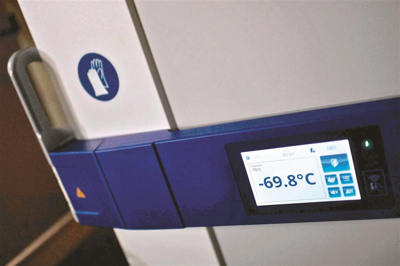 歐盟定二十七日展開新冠疫苗接種。圖為巴黎郊區存放輝瑞疫苗的冷凍庫,二十六日顯示內部溫度接近攝氏零下七十度,這些疫苗將配送到法國各地。圖/法新社