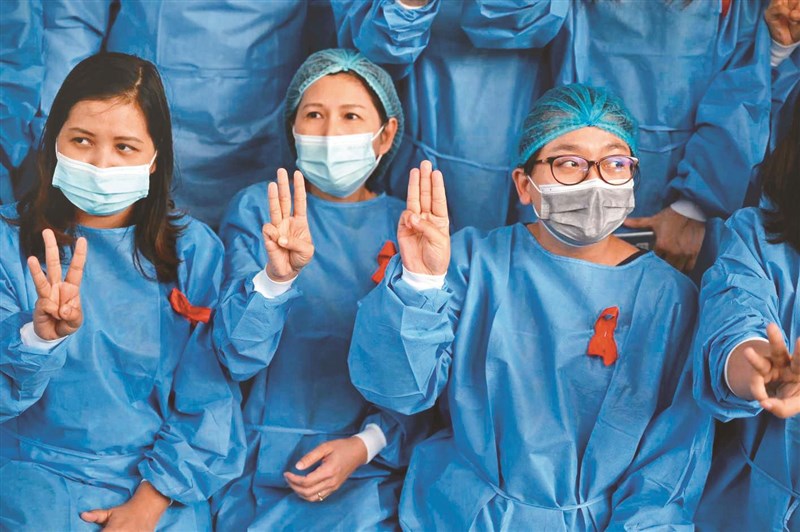 「緬甸公民不服從運動」有三十座城鎮七十家醫院醫護人員罷工,抗議軍方奪權。圖為三日緬甸仰光醫護人員比出三指,並在醫護服別上紅緞帶,表達抗議。圖╱法新社