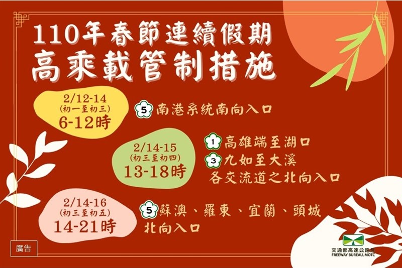 春節國道疏運、高乘載措施 一張圖全掌握 |2021.02.09 語音朗讀 2214觀看次 字級 大 中 小 110年春節連續假期國道高乘載管制,考量防疫,預期國道會比往年擁塞,大家務必掌握國道管制措施與即時路況。圖/高公局提供 【本報台北訊】農曆春節將至,根據交通部觀光局統計,初一至初三,全台訂房率已超過50%,其中又以花東地區最高,訂房率近80%。高公局表示,今年春節連假為10~16日,總計7天,綜合歷年資料,南向交通向集中在初一至初三,其中又以初二南向最大量,為平日1.6倍;北向集中在初三~初五,其中又以初四北向最大量,為平日1.8倍,預估中部局部路段將壅塞至凌晨。圖/高公局提供高公局表示,雙向最大量為初三,預估車流量達140百萬車公里,為平日的1.6倍。由於花東地區的春節訂房量已近8成,預估預估將有大量車潮利用國5往返花東地區,高公局說,初一至初三,南向旅行時間預估將達平日五倍,初三~初五北向旅行時間預估將達平日七倍,建議欲前往東部地區民眾多搭乘公共運輸。國5將持續實施多項大客車優先通行措施,搭乘大客車較自行開車可節省30分鐘以上。圖/高公局提供高公局表示,為疏導春節連假期間車流,將於連假期間針對尖峰時段實施高乘載措施,初一初三每日6~12時,實施國5南港系統交流道南向入口匝道高乘載管制。初三至初五每日14~21時,實施國5蘇澳、羅東、宜蘭及頭城交流道北向入口匝道高乘載管制,初三至初四每日13~18時,實施國1北向高雄端至湖口、國3北向九如至大溪入口匝道高乘載管制。圖/高公局提供交通部長林佳龍也在臉書上表示,今年考量防疫,預期國道車輛會比往年多,加上降雨,容易出現較嚴重的壅塞情形,提醒大家務必掌握國道管制措施與即時路況,透過時間、運具、路線的分流,避開塞車路段及時段。另也建議民眾可利用台9替代國5路段,台61西濱快速公路替代國1及國3路段,台63替代國6路段。 前一篇文章 吃素易貧血! 這7種造血神器食物一定要吃 下一篇文章 兩天連三起規模5以上地震 不排除大地震前震 熱門新聞 01記得與忘記2026.01.0802悍將、雄鷹補戰力 拚闖季後賽2026.01.0903運動後分泌的肌肉激素是萬能荷爾蒙2026.01.1004台水潮州營運所落成 佛光山灑淨2026.01.0905全球最長壽貓 30歲等同120歲人瑞2026.01.0806社論--老宅延壽與老屋安住2026.01.1007南二監佛堂落成 佛光山灑淨祈福2026.01.1008福山寺贈吉祥公益米 送暖彰化社區2026.01.1209世界最萌雄馬 身高僅52.6公分2026.01.0810村民墊腳石 竟是1.9億年恐龍足跡化石2026.01.08 訂閱電子報 台北市 天氣預報 台灣一週天氣預報 相關報導 顧立雄:斷續收到墜海F-16黑盒子訊號搜救F-16飛官 海巡艦艇未發現油汙社宅跳票 擬助37.5萬空屋出租中捷橘線延伸海線 有譜F-16防撞系統列標配 明年全數安裝租屋、外食壓力未減 終結高通膨 去年CPI年增1.66%