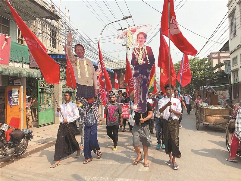 緬甸反政變示威群眾,八日高舉實質領袖翁山蘇姬的立牌抗議。圖╱美聯社