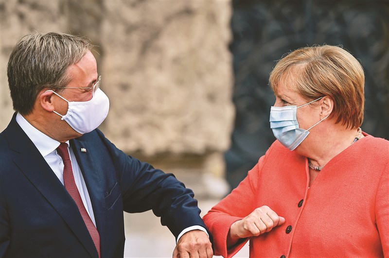 德國總理梅克爾(右)的接班人、基民黨黨魁拉謝特(左)出師不利,在西南部兩邦的地方議會選舉,基民黨大敗。圖/美聯社
