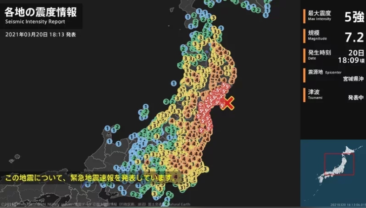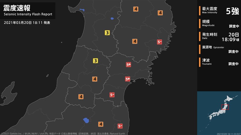 NHK報導,日本東北部宮城縣沿海當地時間20日傍晚6時9分發生規模7.2強震。圖/截自推特