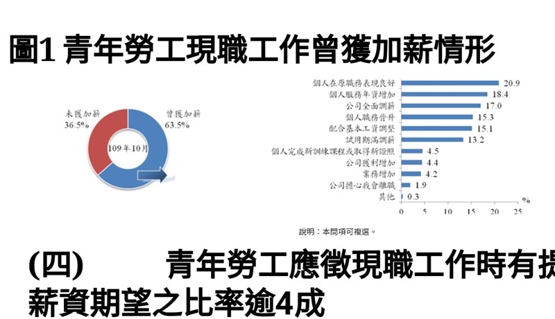 根據調查,109年青年勞工現職工作平均薪資為32287元,較108年增684元或2.2%,較101年增4862元或17.7%,63.5%曾獲加薪,加薪原因以「個人在原職務表現良好」占20.9%最高,「個人服務年資增加」占18.4%次之。若與初次就業時相較,青年勞工薪資有增加者占62.5%,平均增加4600元。