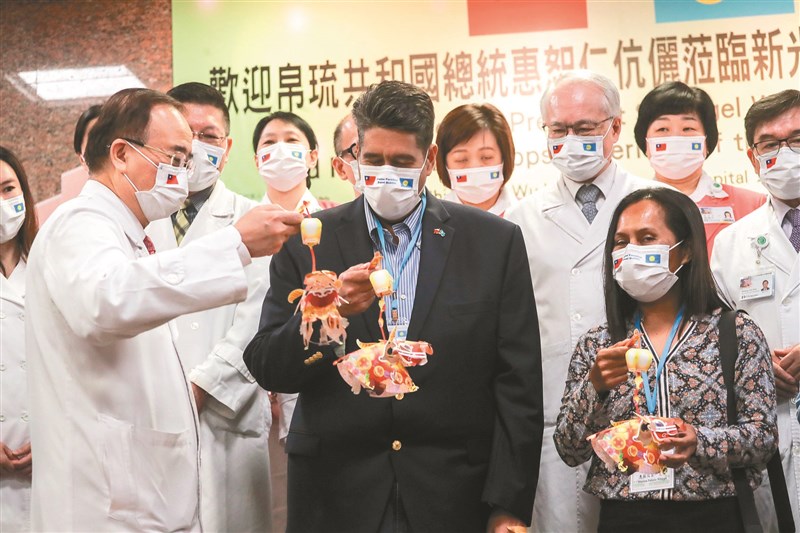 帛琉總統惠恕仁(前中)率團訪台,昨天到新光醫院進行健康檢查,新光醫院院長侯勝茂(前左)致贈牛年小提燈。圖/中央社